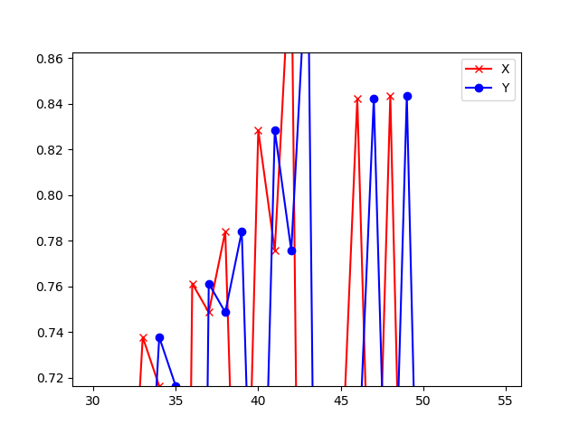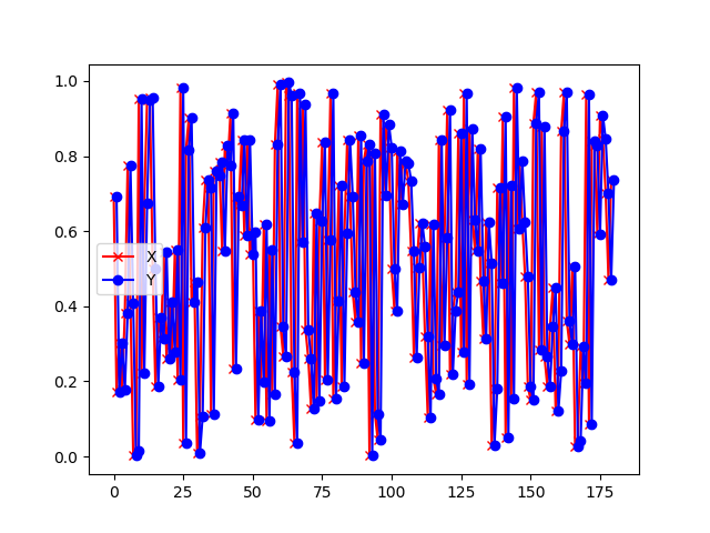 其中,红色叉子为样本数据点,蓝色圆点为标签数据点,它总是落后于样本数据一个时间步。还可以看到以上数据形成的曲线完全随机,毫无规律。