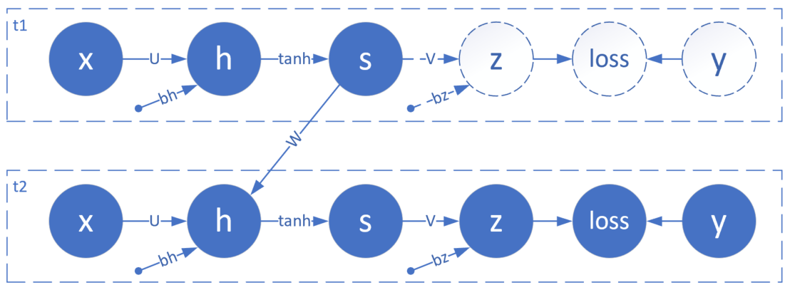 对于t2: $$ h_{t2}=x_{t2} \cdot U + s_{t1} \cdot W +b_h\tag{3} $$