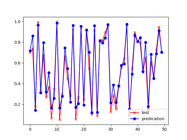 红色x是测试集样本,蓝色圆点是模型的预测值,可以看到波动的趋势全都预测准确,具体的值上面有一些微小的误差。