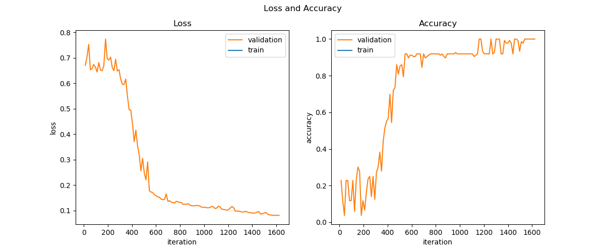 我们设定在验证集上的准确率为1.0时即停止训练,图19-13为训练过程曲线。