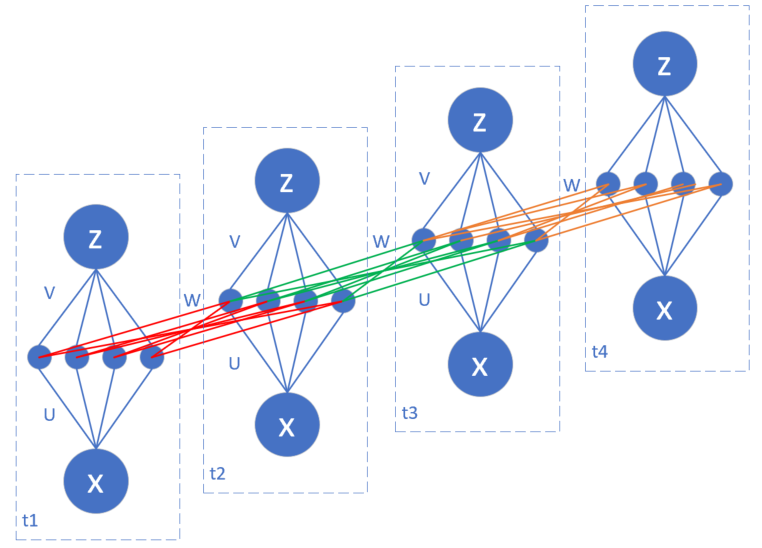 在19.1节的例子中,连接x和h的是一条线标记为U,U是一个标量参数;在图19-11中,由于隐层神经元数量为4,所以U是一个 1x4 的参数矩阵,V是一个 4x1 的参数矩阵,而W就是一个 4x4 的参数矩阵。我们把它们展开画成图19-12(其中把s和h合并在一起了)。
