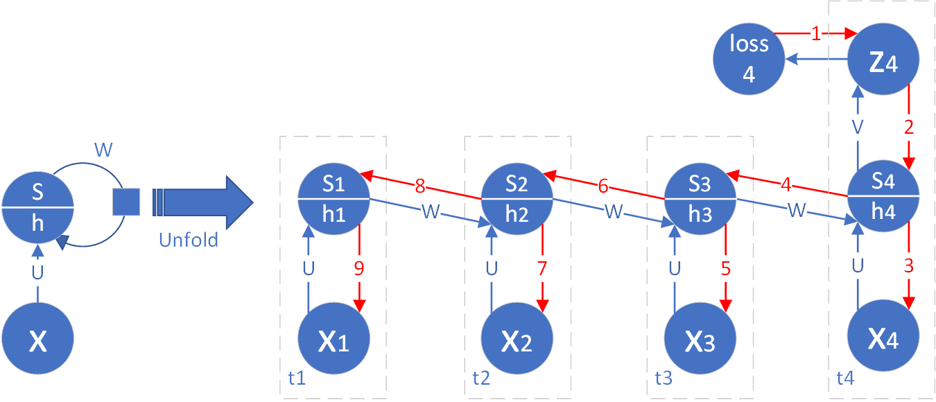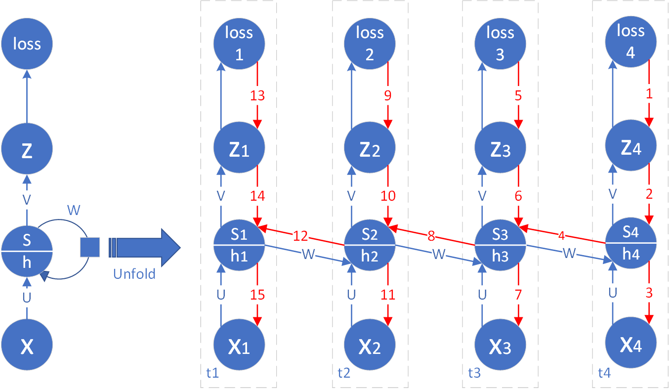 图中蓝色箭头线表示前向计算的过程,线上的字符表示连接参数,用于矩阵相乘。红色的箭头线表示反向传播的过程,线上的数字表示计算梯度的顺序。