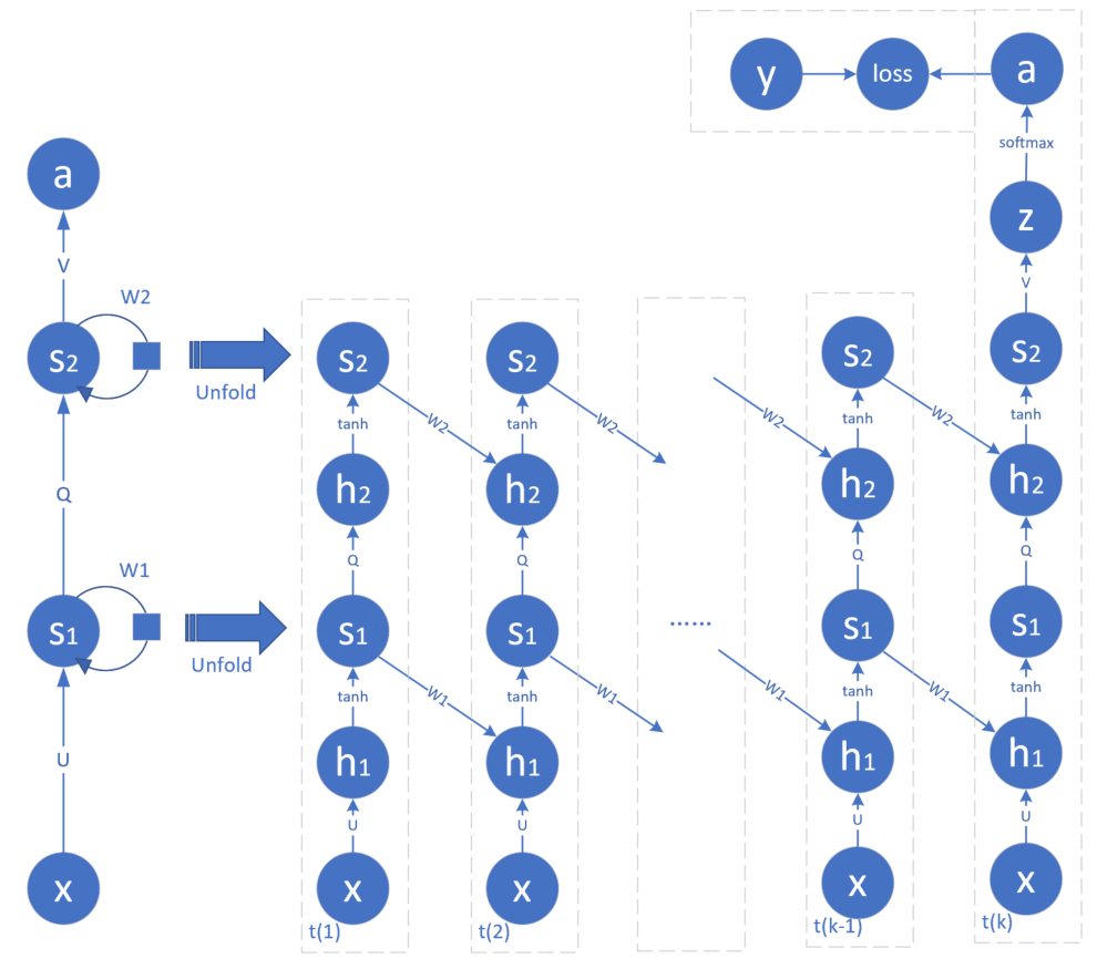 对于第一个时间步: $$ h1 = x \cdot U \tag{1} $$ $$ h2 = s1 \cdot Q \tag{2} $$