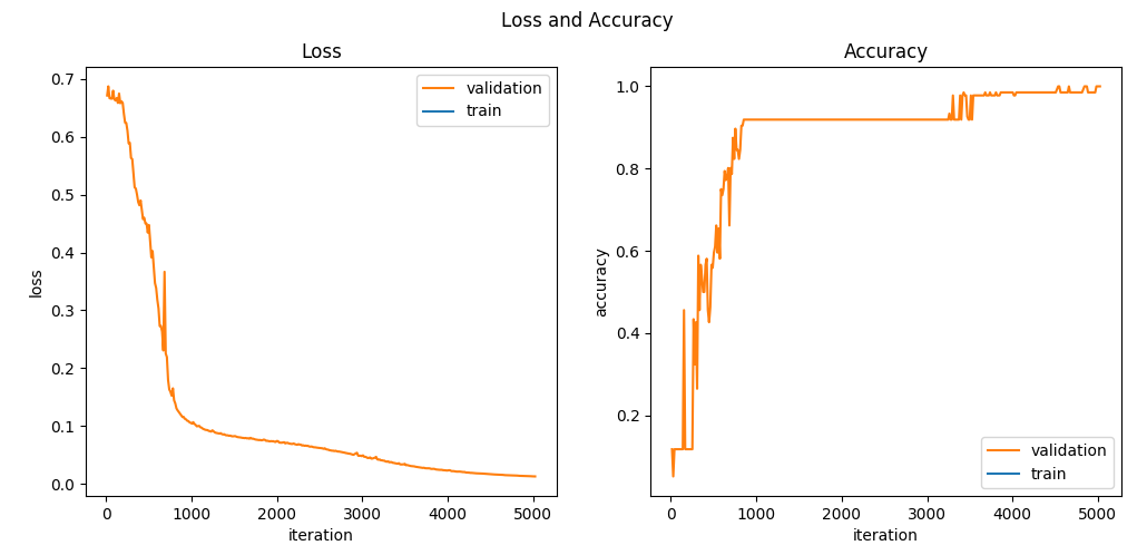 self.loss_trace.ShowLossHistory("Loss and Accuracy", XCoordinate.Iteration)