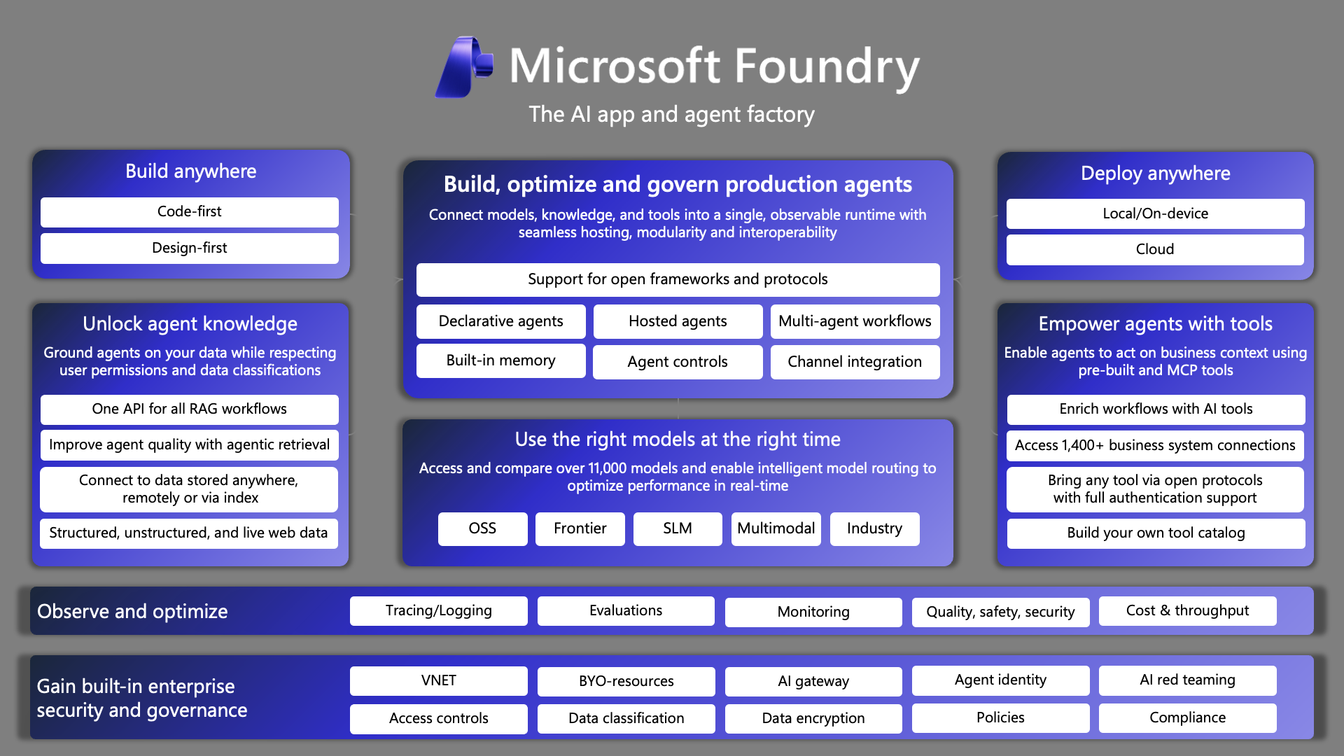 - Microsoft Foundry Agent Service: Build and deploy AI agents with integrated tools and observability.
