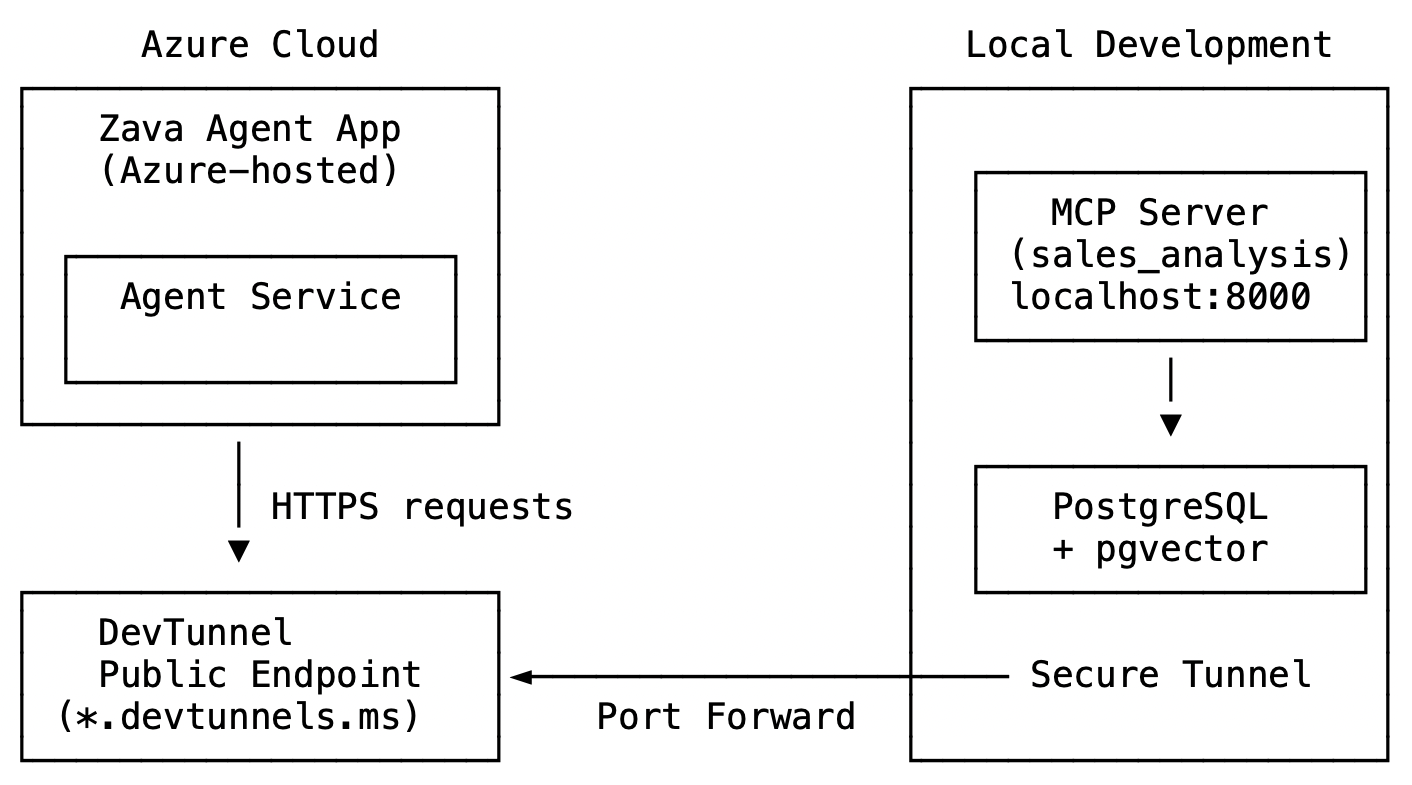 https://abc123.devtunnels.ms) connected tolocalhost:8000. - Azure Integration: The Azure-hosted Agent Service connects to the MCP Server through the DevTunnel endpoint.