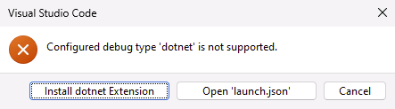 dotnet not supported when launching the debugger: Ensure you install the C# extension in Visual Studio Code. If you have already installed it, try restarting Visual Studio Code.