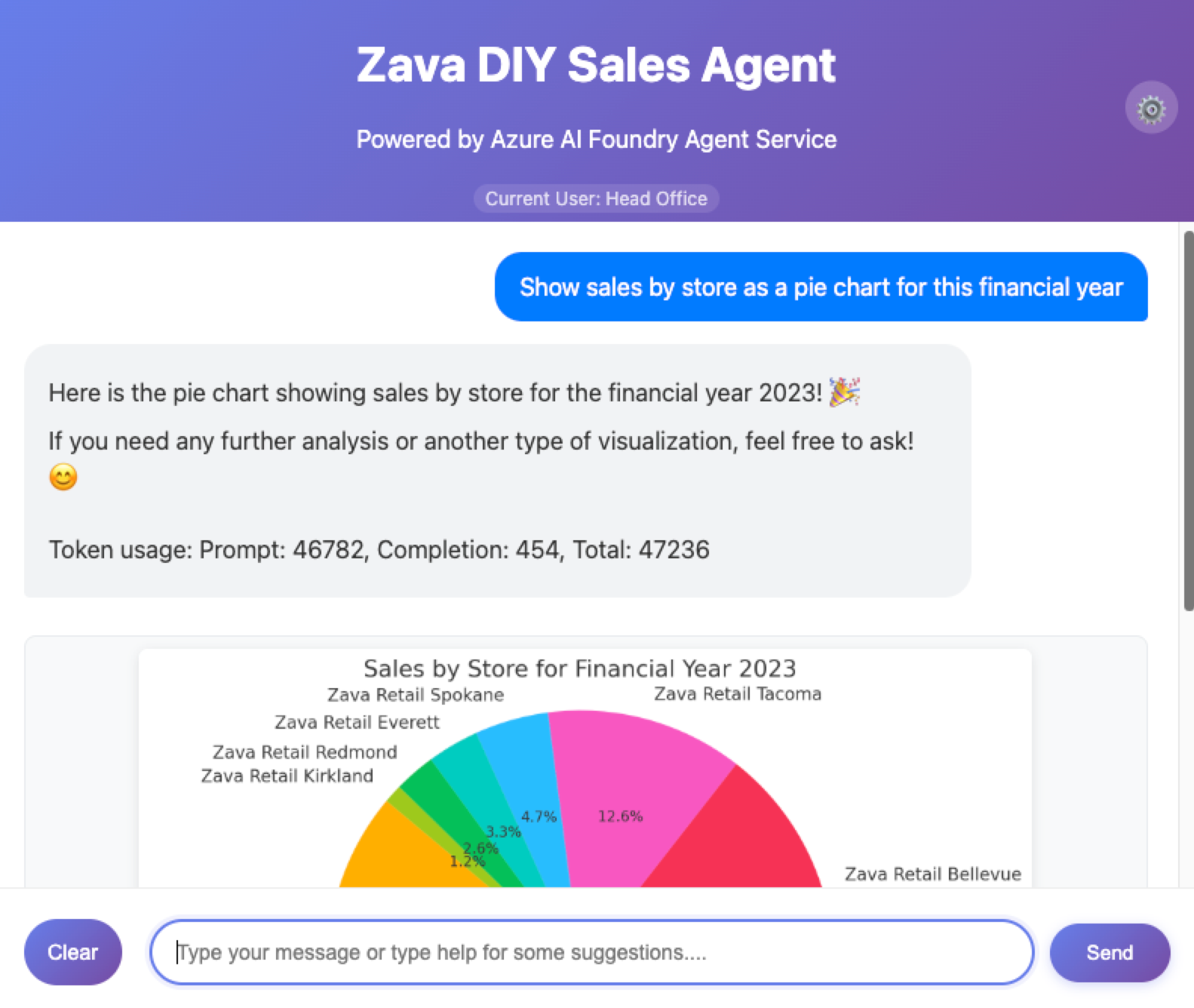 From the web chat client, you can start a conversation with the agent. The agent is designed to answer questions about Zava's sales data and generate visualizations using the Code Interpreter.