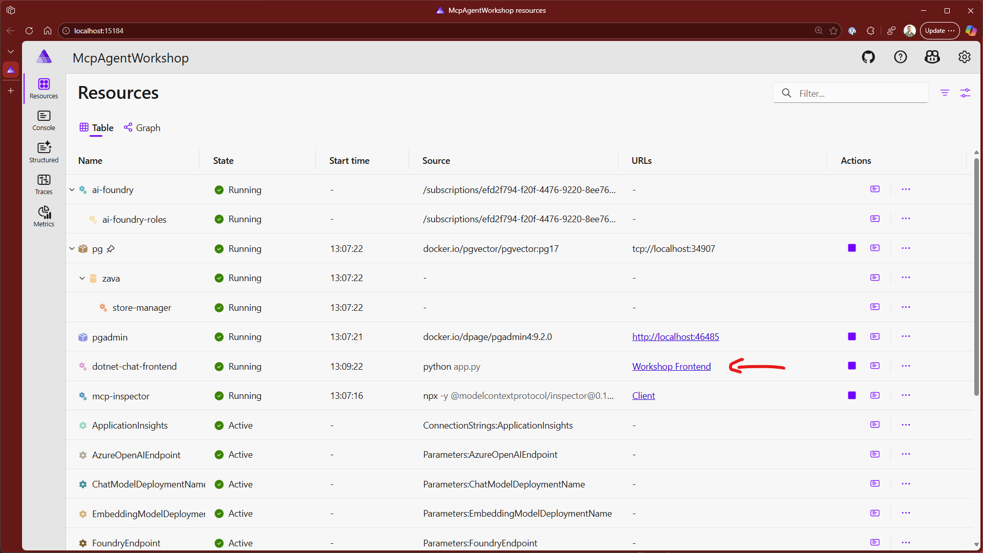 Once the debugger has launched, a browser window will open with the Aspire dashboard. Once all resources have started, you can launch the workshop web application by clicking the link Workshop Frontend.