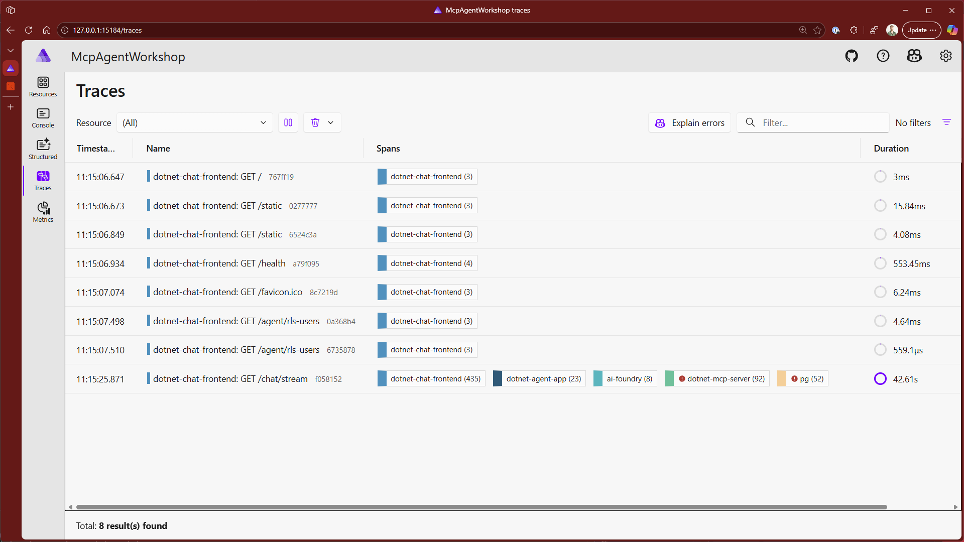 resource to see the calls made to the MCP Server by the Azure AI Foundry Agent Service.You can also open the trace view and find the end-to-end trace of the application, from the user input in the web chat, through to the agent calls and MCP tool calls.