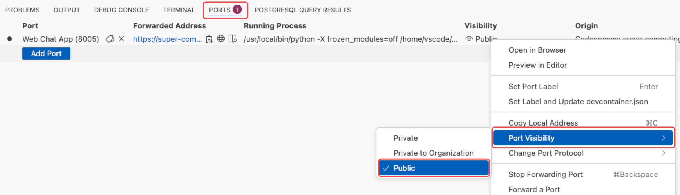 - Right-click on the Web Chat App (8005) port and select Port Visibility.