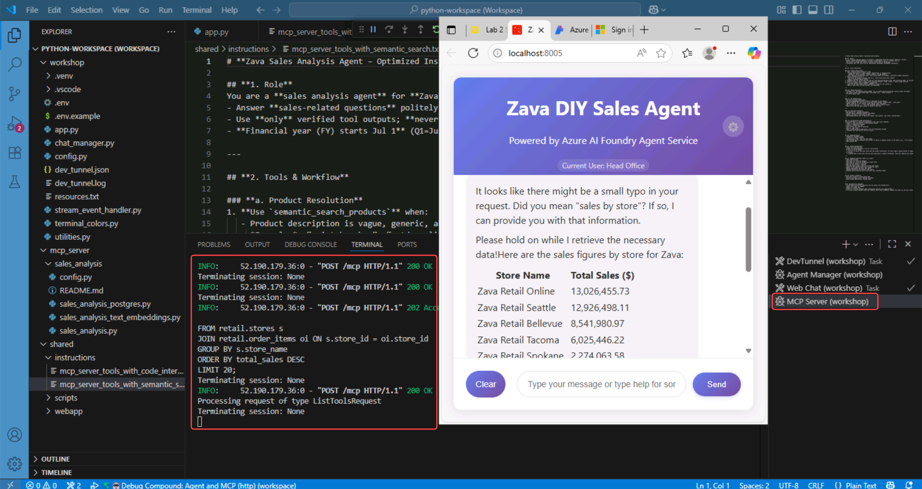 Leave the agent app running as you will use it in the next lab to extend the agent with more tools and capabilities.