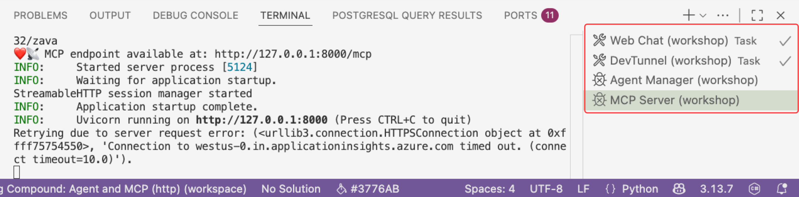 Switch back to VS Code and select MCP Server (workspace) from the TERMINAL panel and you'll see the calls made to the MCP Server by the Azure AI Foundry Agent Service.