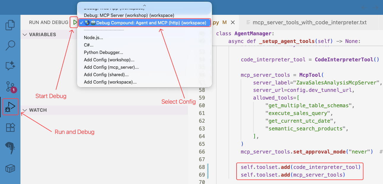 - Select the "🌎🤖Debug Compound: Agent and MCP (http)" as the launch configuration.