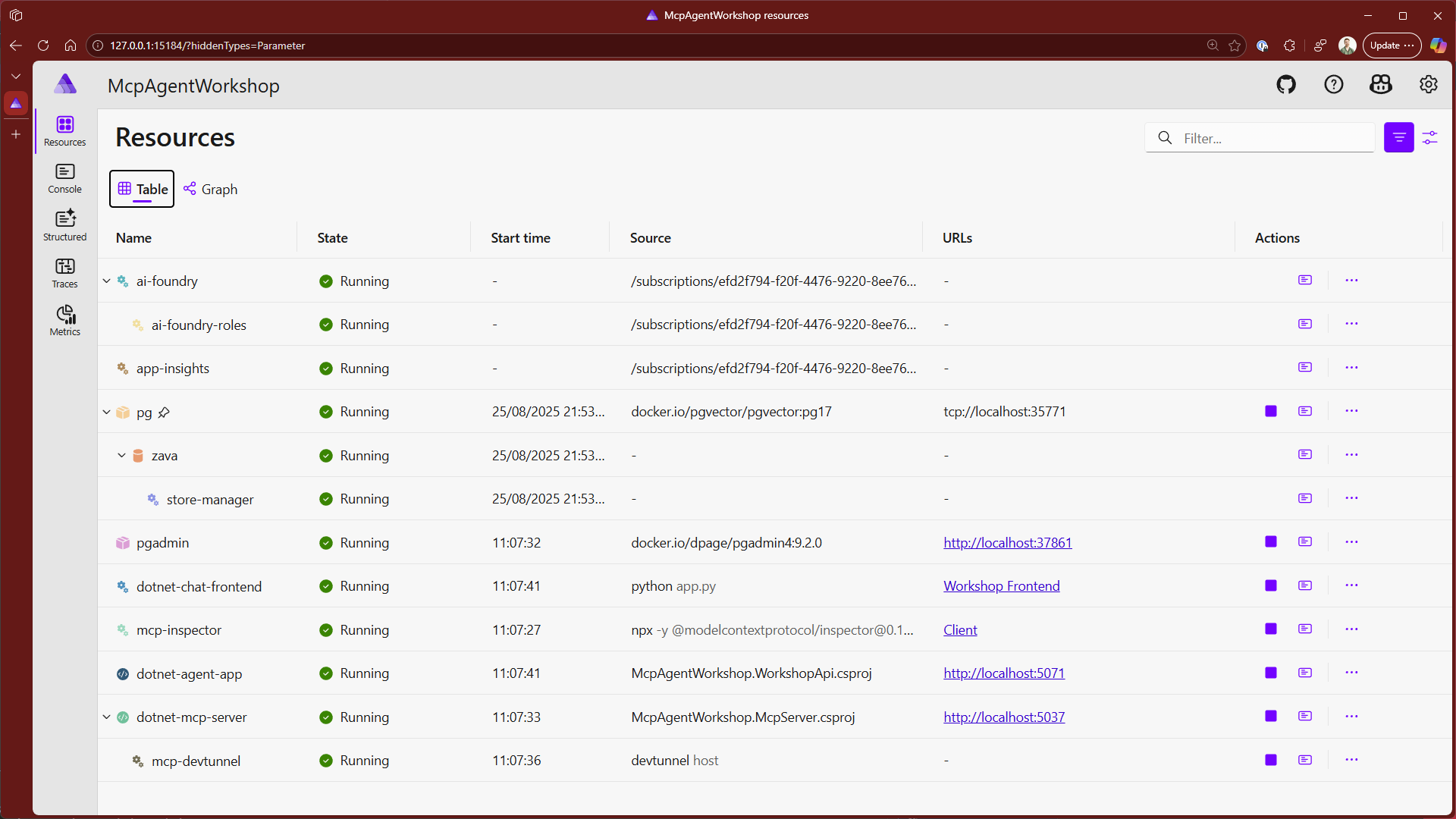 Launch the application by pressing F5 and wait for the Aspire Dashboard to appear in your browser. This will show a full list of the resources in the workshop.