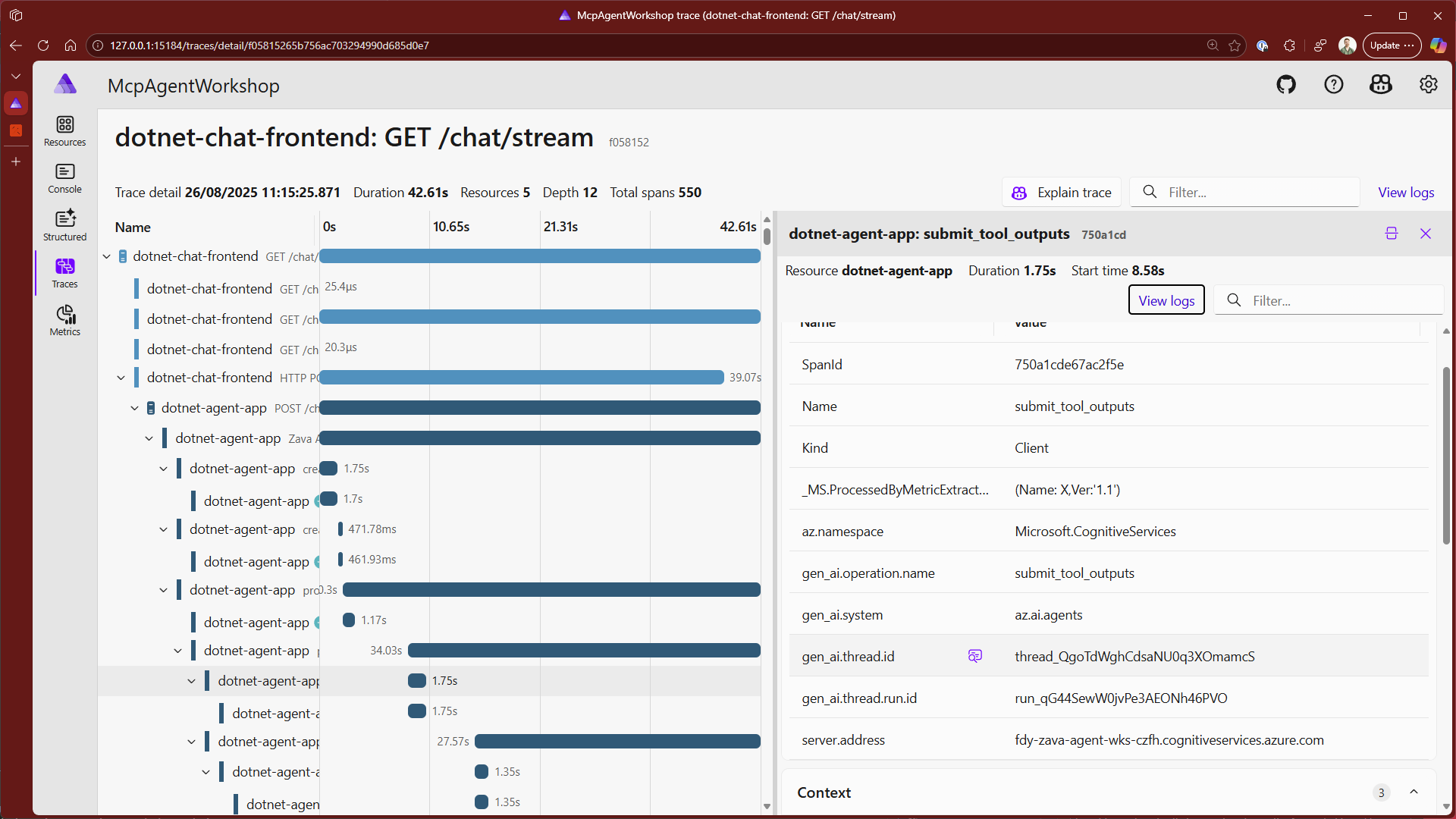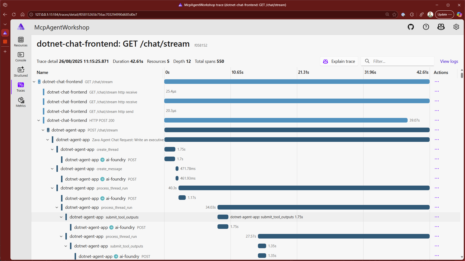 So far for our tracing, we've focused on how to visualise this via the Azure AI Foundry dashboards, which can be a break in the workflow when developing locally. In addition to that, we can leverage the Aspire Dashboard to visualise the traces generated by our application in real-time, and how an action spans across multiple resources within our system.