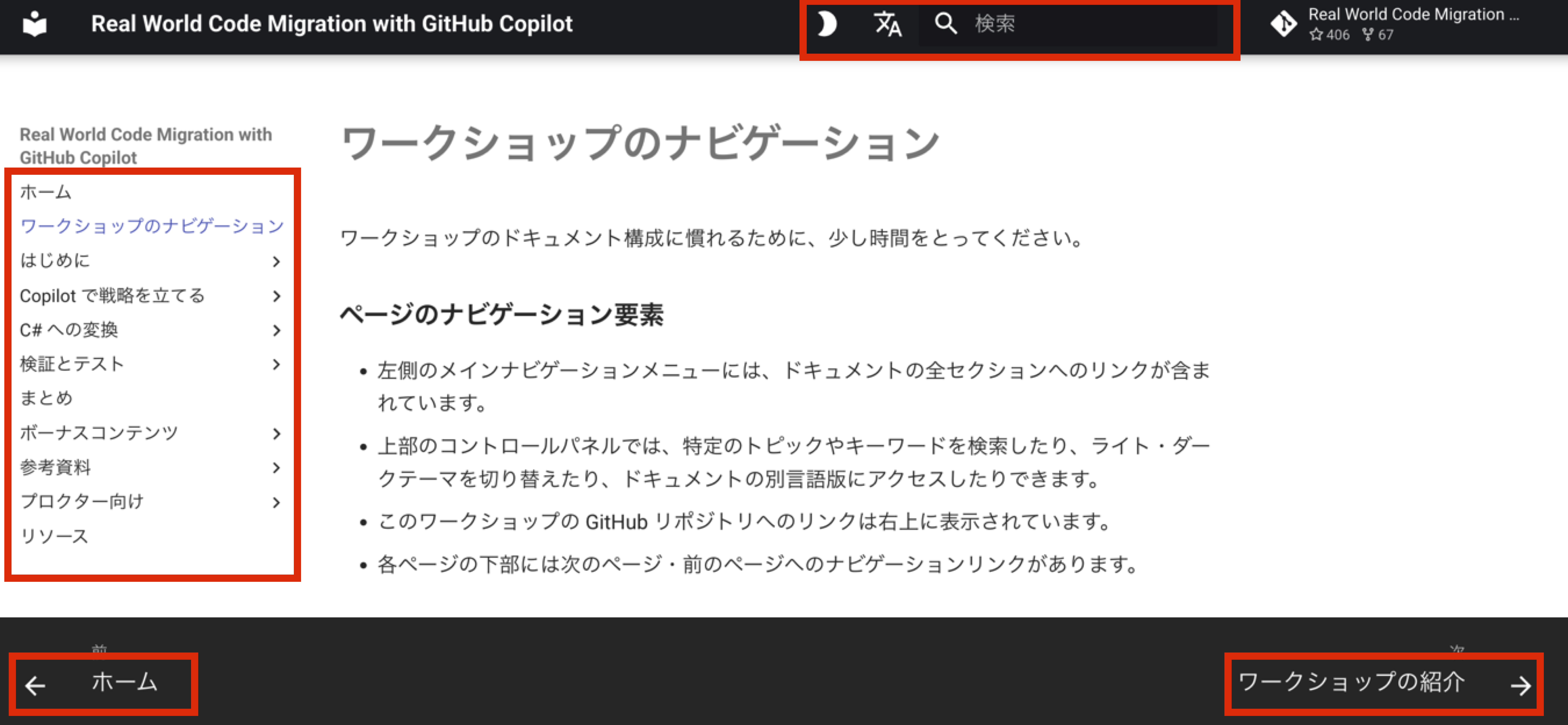- このワークショップの GitHub リポジトリへのリンクは右上に表示されています。