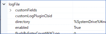 1 | <logFile logTargetW3C="File" directory="%SystemDrive%\inetpub\logs\LogFiles" enabled="true" /> |