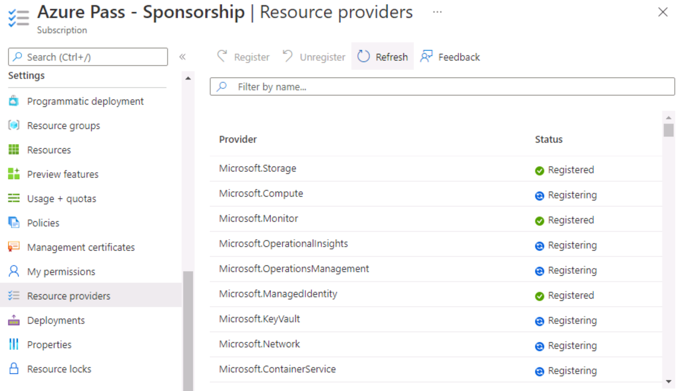 - Watch the progress of the registration process until all the providers listed above have been registered. Click the Refresh button every few minutes to update the progress. Once everything has been registered, continue with the tasks in this lab.