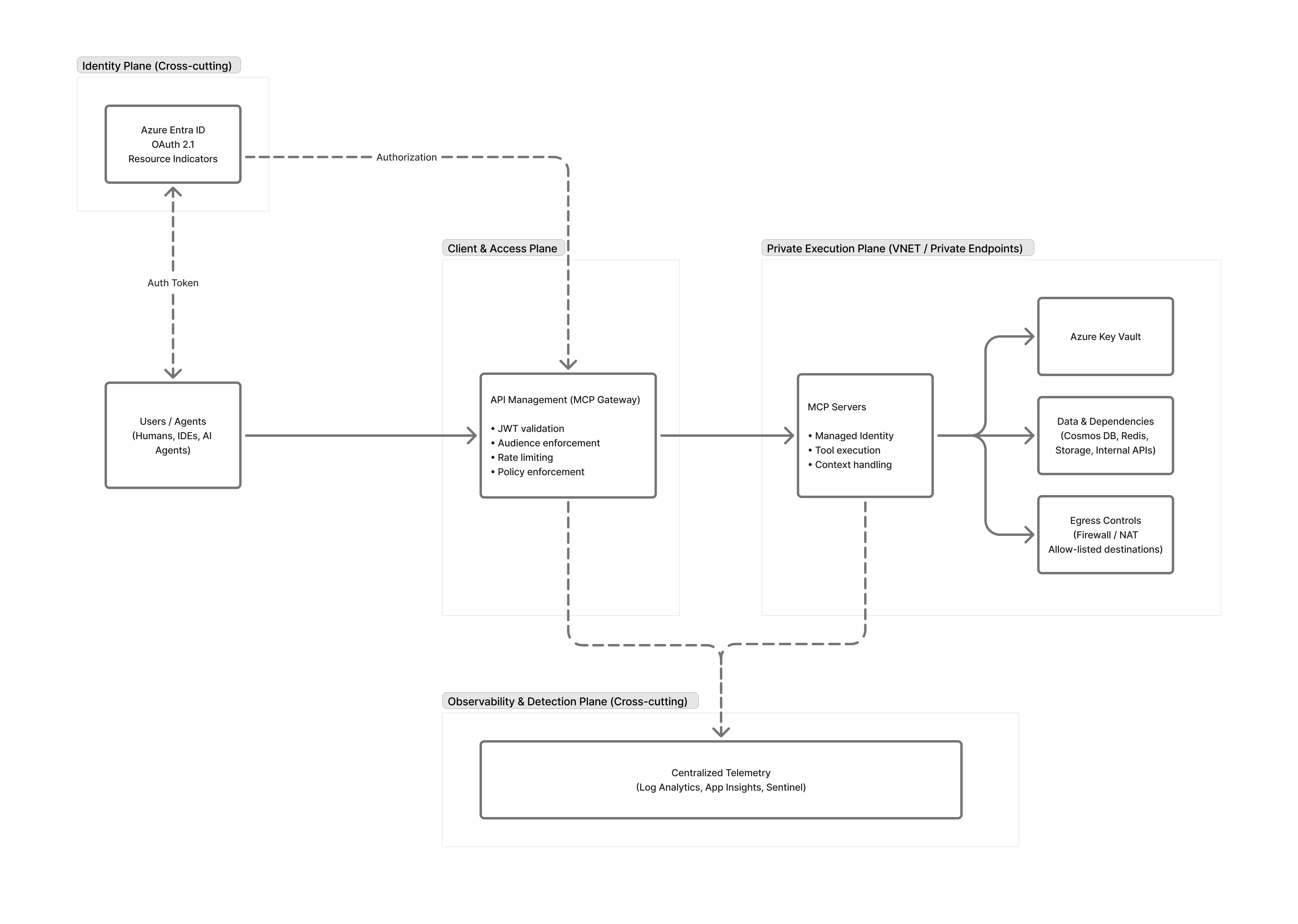 The diagram above illustrates a high-level reference architecture for deploying MCP servers securely on Azure. It highlights the primary trust boundaries and security layers involved in an MCP system, from identity and gateway enforcement to private execution, data access, and centralized telemetry.