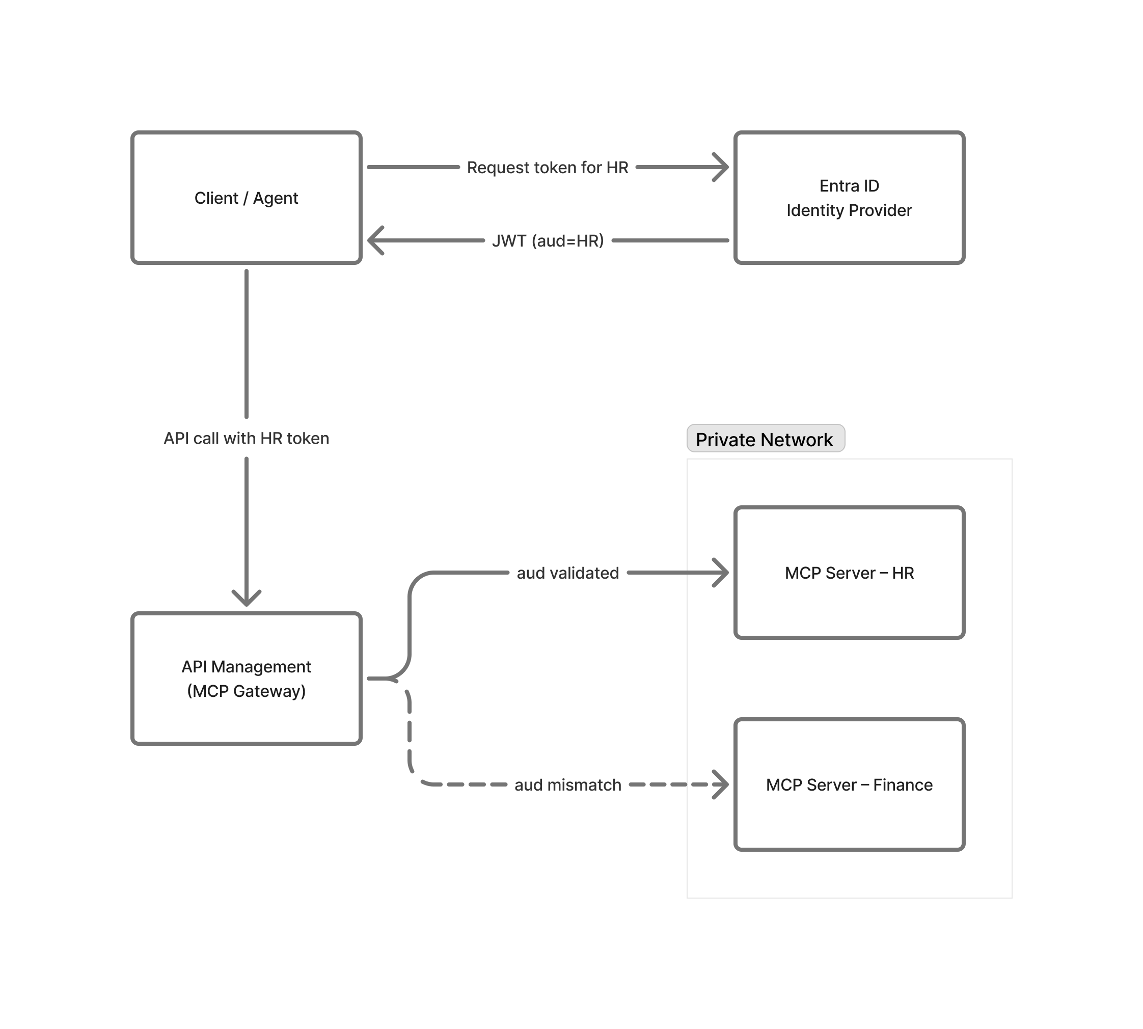 Azure API Management validates the aud (audience) claim on every request. Tokens issued for the HR MCP server are rejected by the Finance MCP server because the audience does not match.