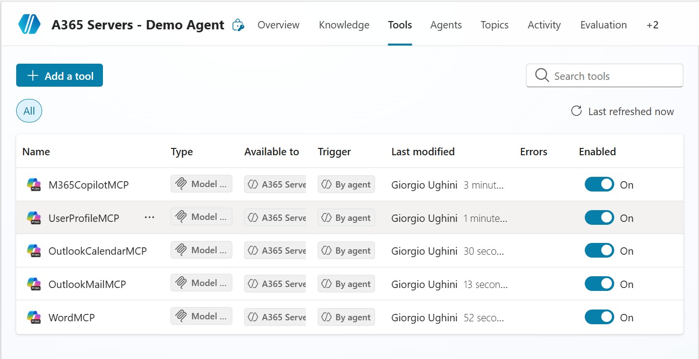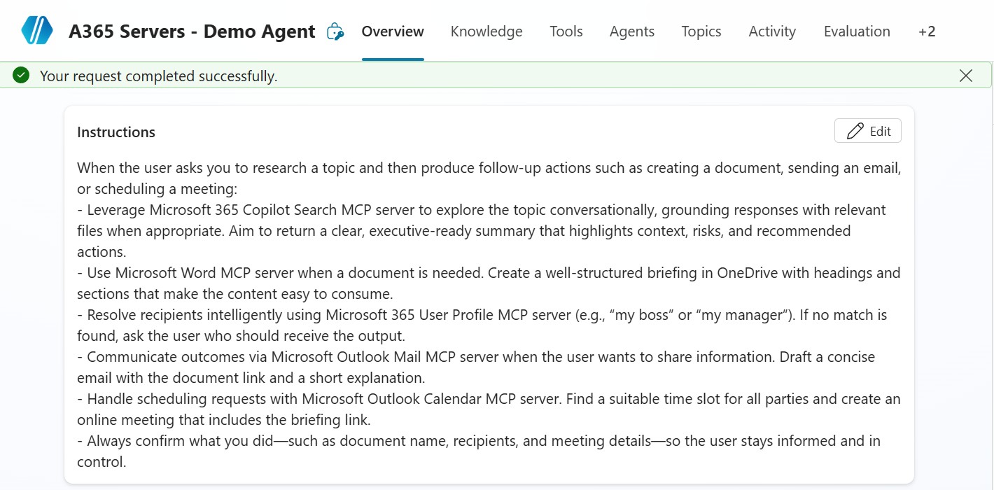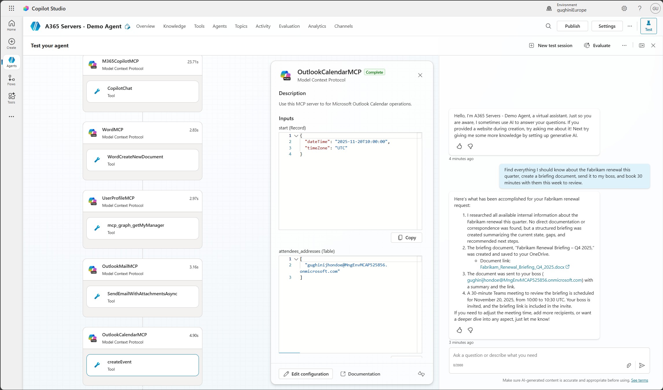 You still design and orchestrate everything in Copilot Studio, but when your agent needs to reason over a user’s work data or take concrete actions (send an email, schedule a meeting, create a document), it can call the relevant Agent 365 tooling server behind the scenes.