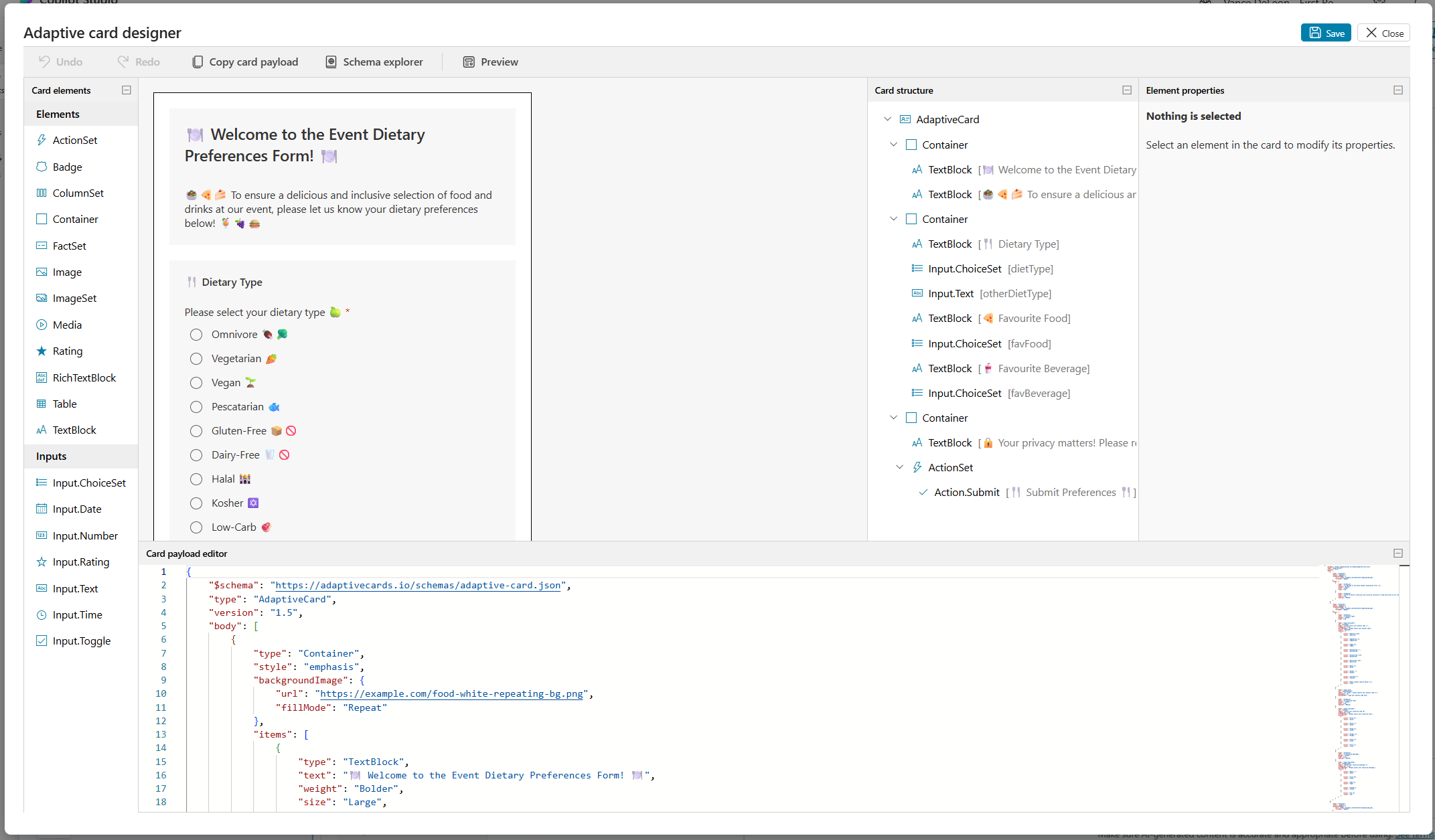 A quick copy/paste later, and it’s rendered in the Adaptive Card Designer: