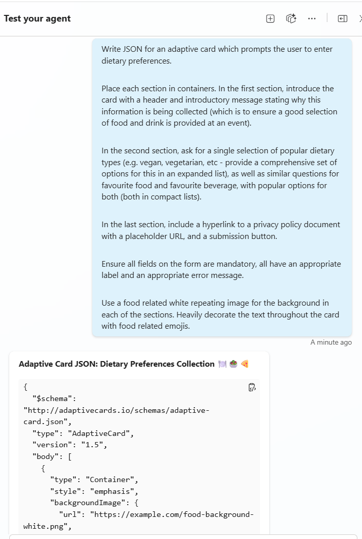 The answer to my JSON woes has literally been there right in front of me the whole time; the Test Pane. Perhaps I’m a little late to the party with this, but I’ve recently realised how good Copilot Studio itself is at providing a starting point.