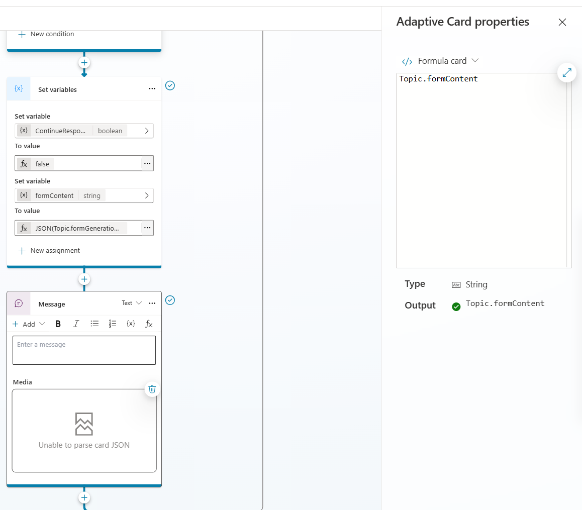 - The output is passed back to the topic, which checks if a card was generated, and if so, pushes the JSON into an Adaptive Card node: