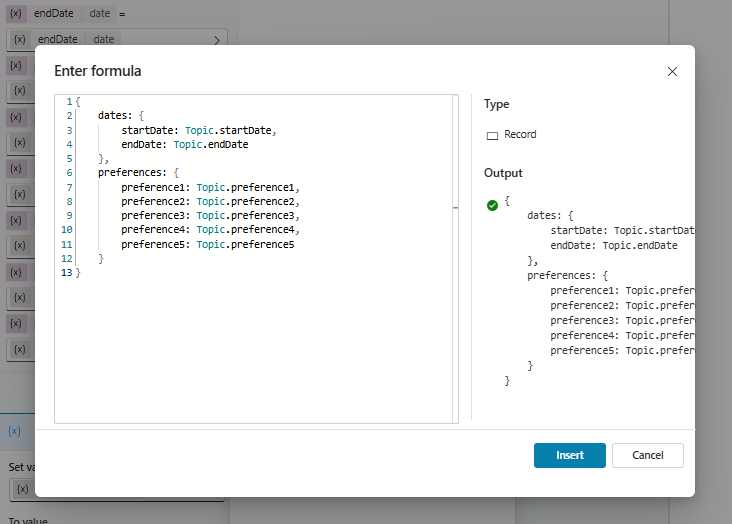Even the output variables are configured for me for use within a topic, and it looks great in conversation: