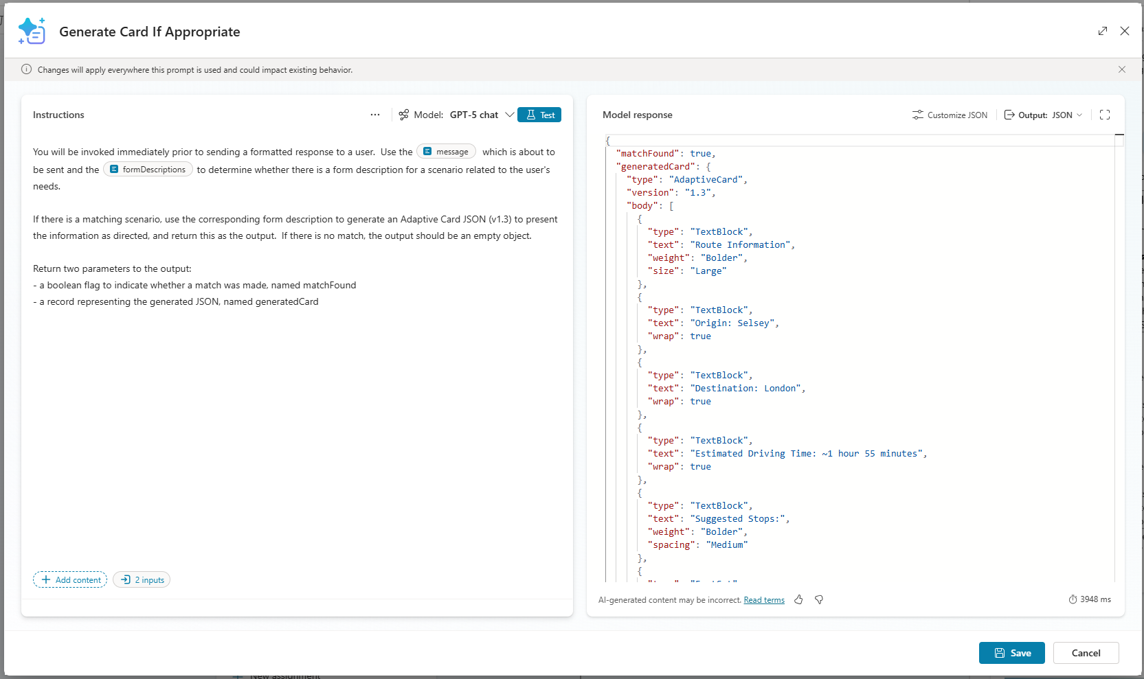 - The custom prompt figures out whether it has a scenario that matches the response, and if so, generates appropriate Adaptive Card JSON