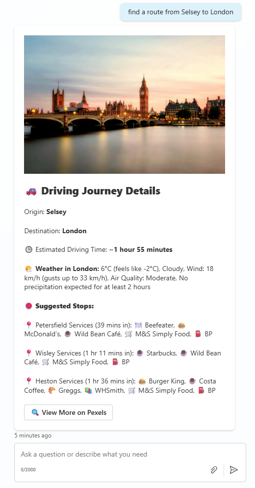 - The orchestrator recognises it needs to call the tools for finding route information and weather information and executes both
