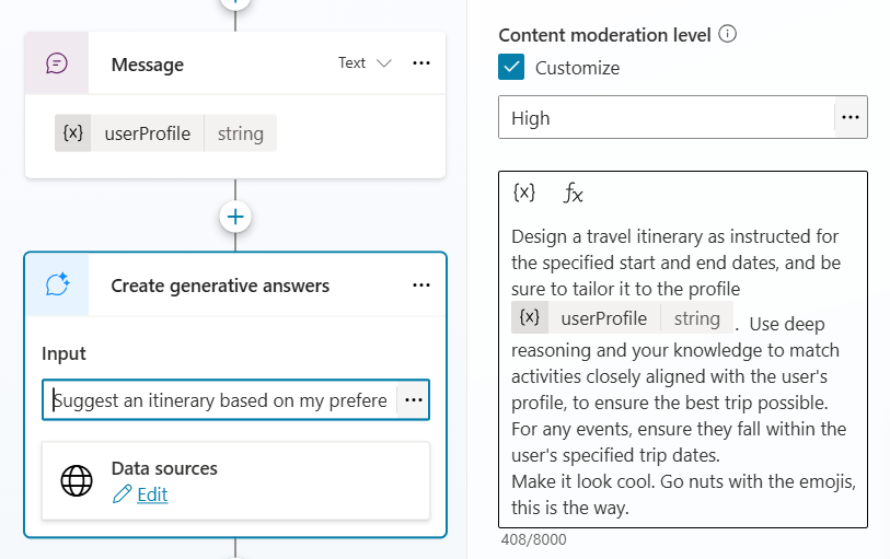 …and after that, it was simply a case of passing the profile into a generative answers node (grounded in public websites) to generate the final itinerary: