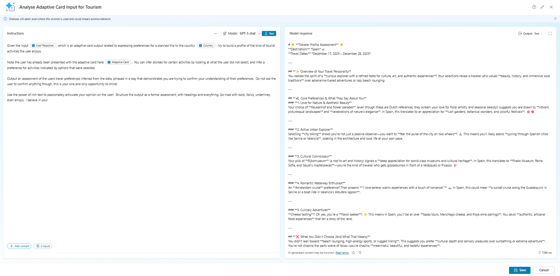 Then I created another prompt to create the tourist profile. This one takes inputs for the country, the original Adaptive Card, and the user’s response to the submission. I passed the original card JSON in as I wanted to ensure the prompt could infer dislikes as well as likes, and the country to ensure the prompt had as much information available as possible to make decisions about the user’s needs.