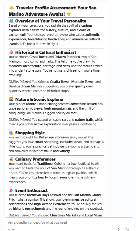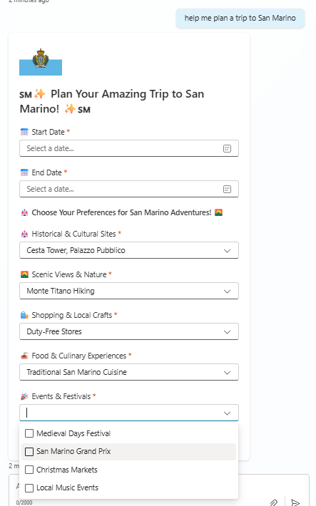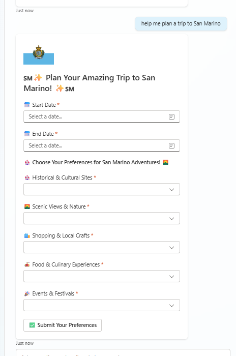 Whilst this could be achieved conversationally, the back-and-forth conversation to ensure the agent knows what’s needed could easily become arduous. A form with a few targeted suggestions, designed to obtain user intent, could be just the ticket to help us generate a tailored tourism profile, which in turn could be used to generate a meaningful and specific itinerary.