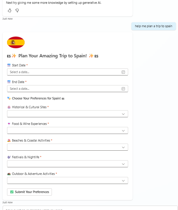 Let’s have a look at my Travel Agent’s response to a request from a user looking to plan a trip to Spain: