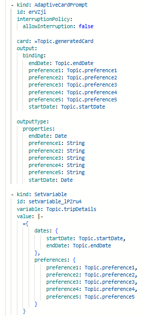 This is all fairly straight forward except for the dynamic nature of the Adaptive Card. I cheated a little and made sure I had a fixed number of questions (look back at the card generation prompt), which meant I could rely on a fixed number of outputs from the card. Manipulating the topic YAML a little…