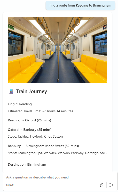 However, if I ask for a different route, I get different information. This time the route information tool has decided a train journey is more appropriate, and as such, the agent has displayed multiple legs of a complete train journey, including changes and stops.