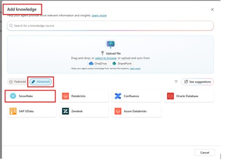 When you create a new Copilot Studio agent or access an existing agent, navigate to: Knowledge tab → Advanced → Select ‘Snowflake’ as a knowledge source