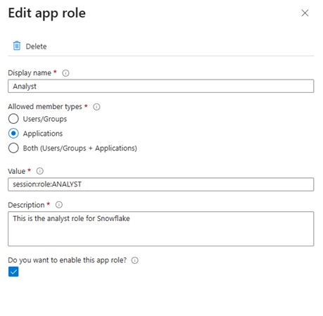 - Define an application role that aligns with the Snowflake “ANALYST” role intended for later creation in Snowflake as we will see in the next section or select an existing Snowflake role if one is already available.