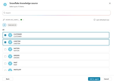 - As a Knowledge Source - Seamlessly grounds your agent knowledge into Snowflake specific selected tables
