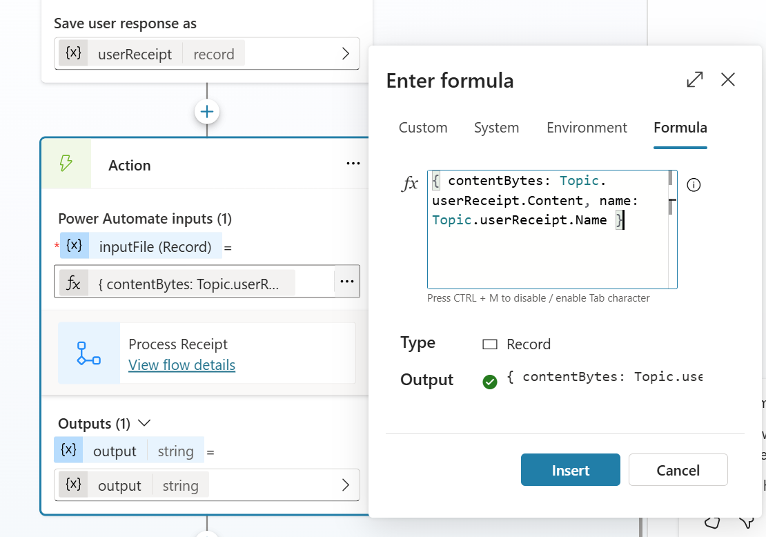 You can add logic in your flow to send this file to SharePoint, ServiceNow, D365 Customer Service, etc. Add your newly created flow to your topic and pass the variable using this Power FX formula: