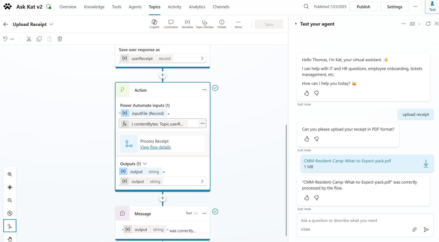 And that’s it! You can now pass a file to an Agent Flow (same for Power Automate) and pass this file to all the connectors available in your Flow (ServiceNow, Outlook, SharePoint, etc).