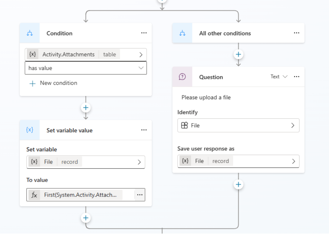 - Prompt the user for file (using the question node with File entity, don’t forget to check “include metadata” in the entity recognition menu) or retrieve it from the activity attachment variable