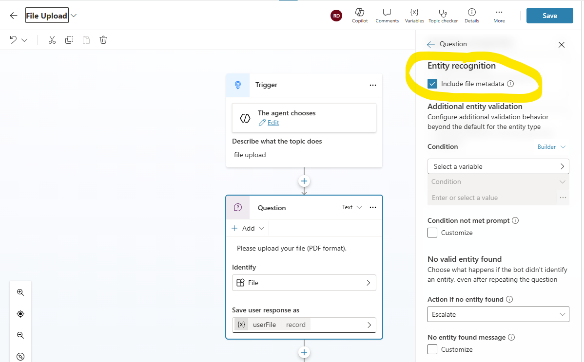 First, create a new topic to retrieve the user’s file. Add a Question node in your topic, set the entity to File, and check the box Include file metadata (under Entity recognition). This ensures the bot collects both the file and its metadata (name, content type, content).
