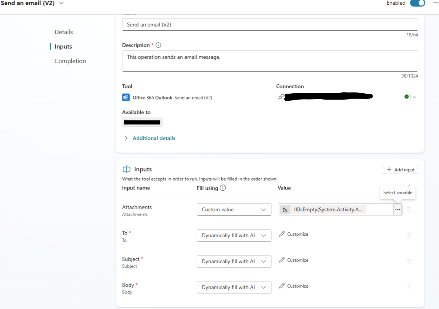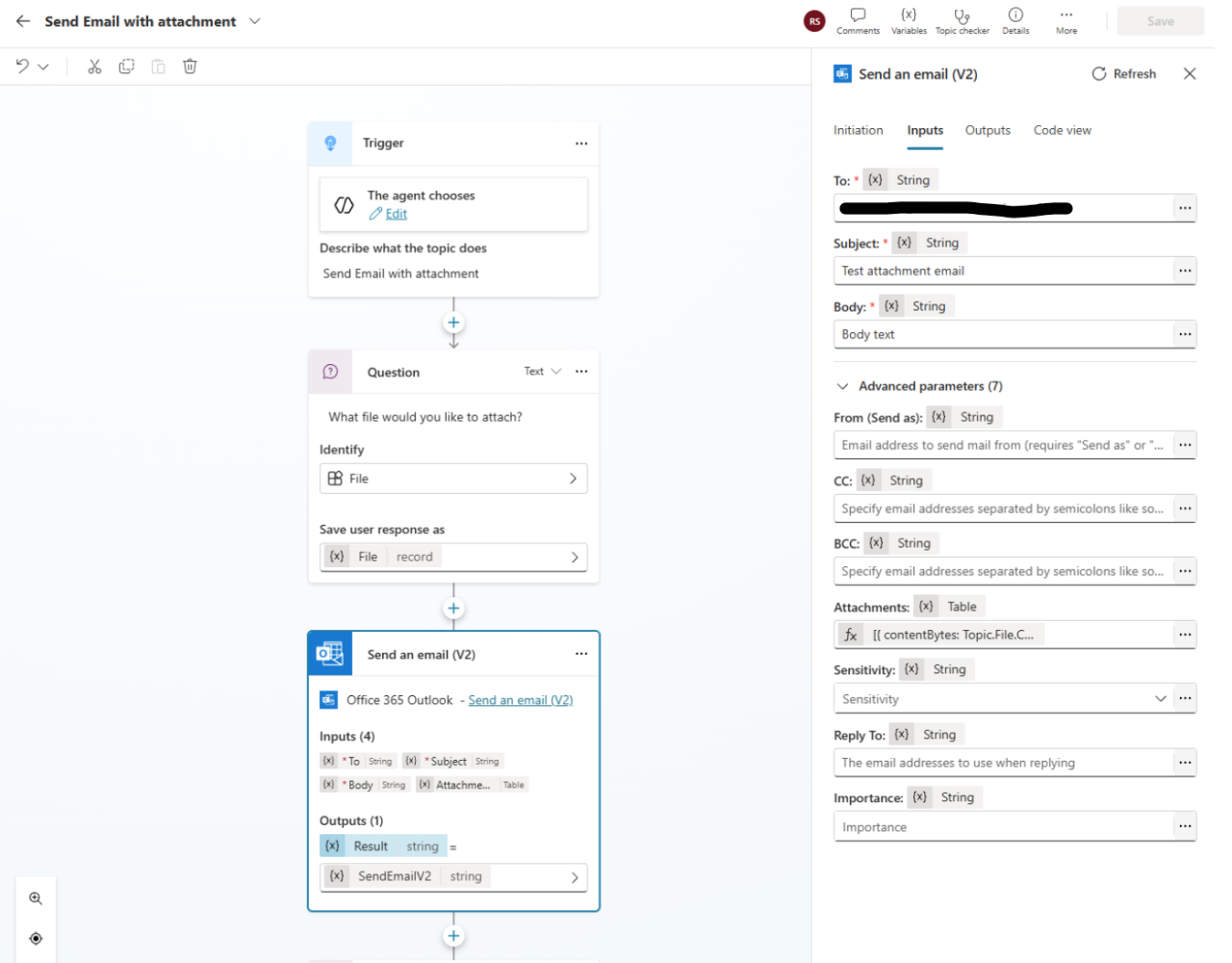 Some connectors have particular requirements to wrap “File” inputs. For example, the “Send an email (V2)” connector has an Attachments input that is a Table of records with