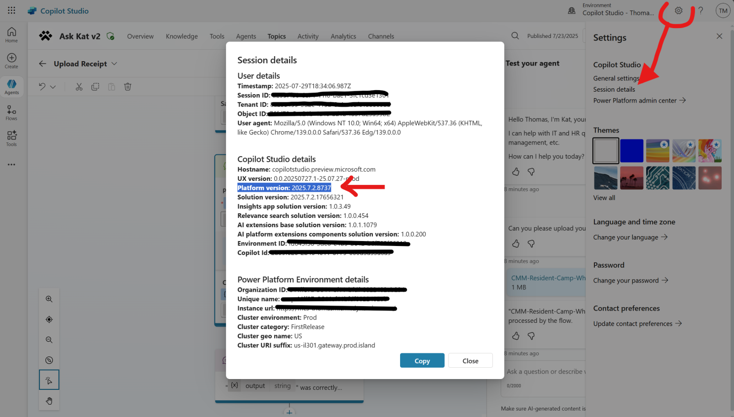 In order to use this new feature, your environment needs to be running version 2025.7.2.xxxx or higher. To check your Copilot Studio version, simply look at the session details in your agent interface.