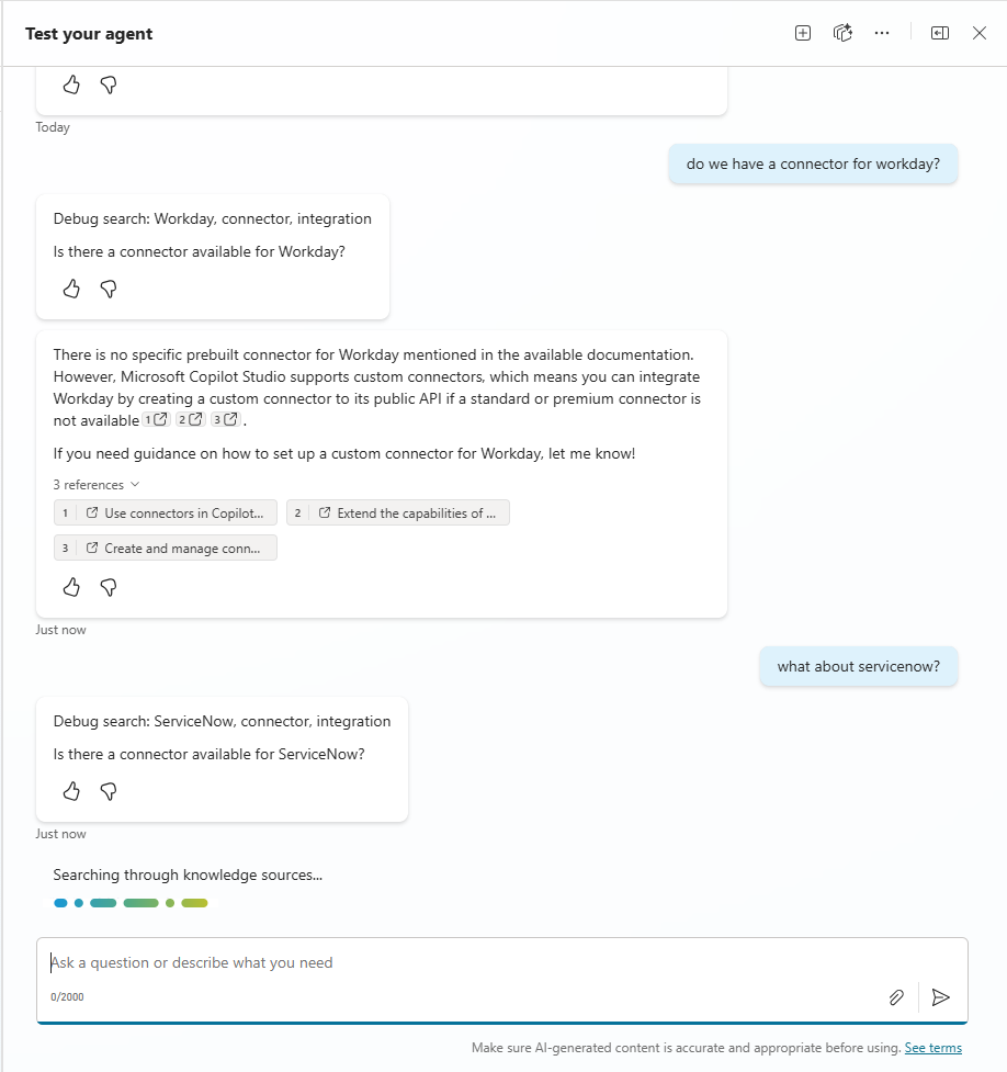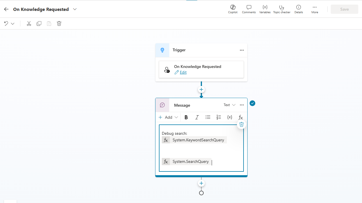 Enable the OnKnowledgeRequested trigger to reveal what the agent is actually searching for: