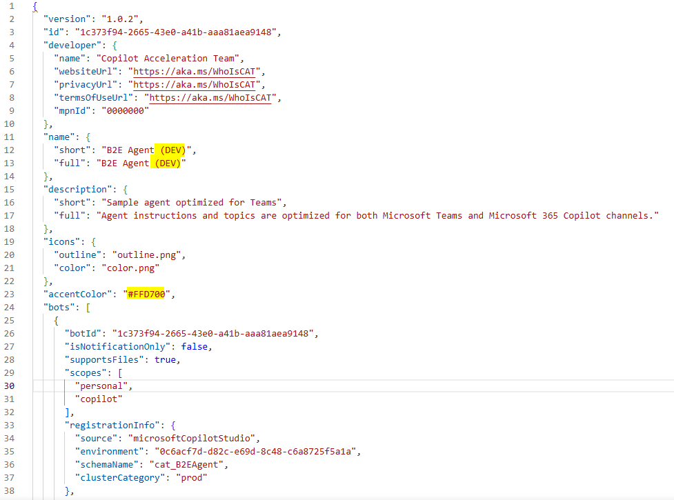 For DEV and TEST environments, you’ll customize the Teams app manifest to differentiate from production. This prevents confusion and makes it immediately obvious which environment users are working with.