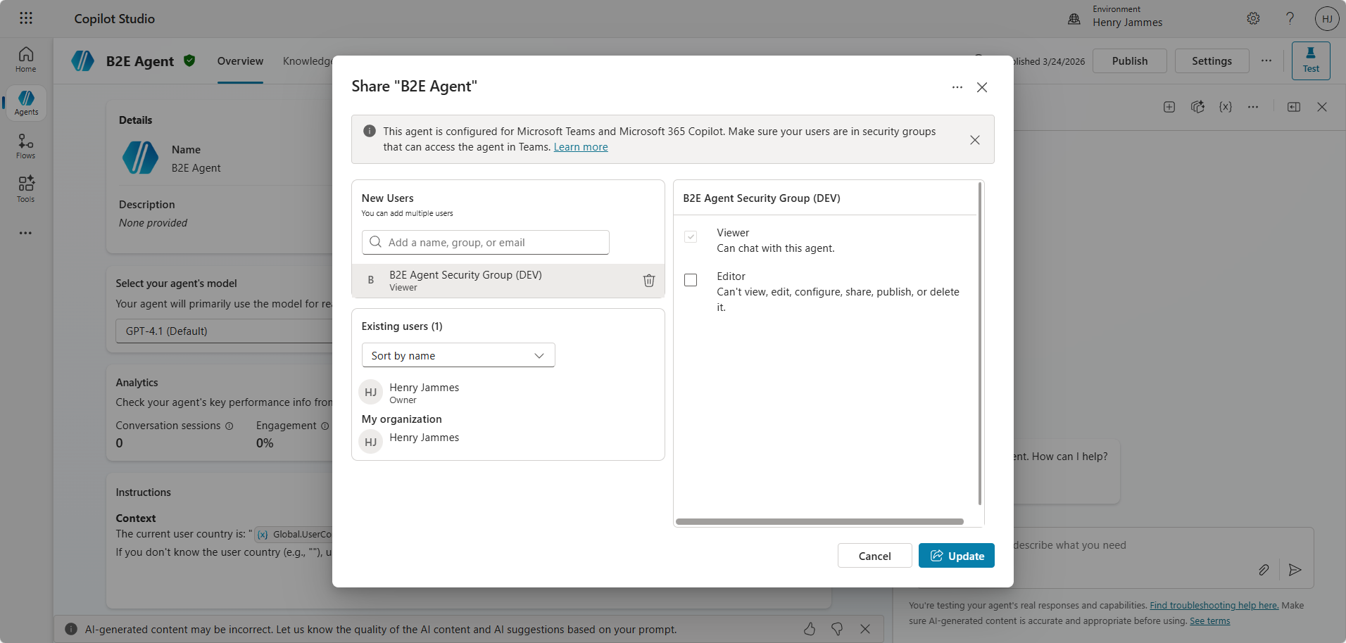 This is the beauty of Copilot Studio’s architecture. Behavioral changes deploy instantly across all environments without touching manifests or admin centers.